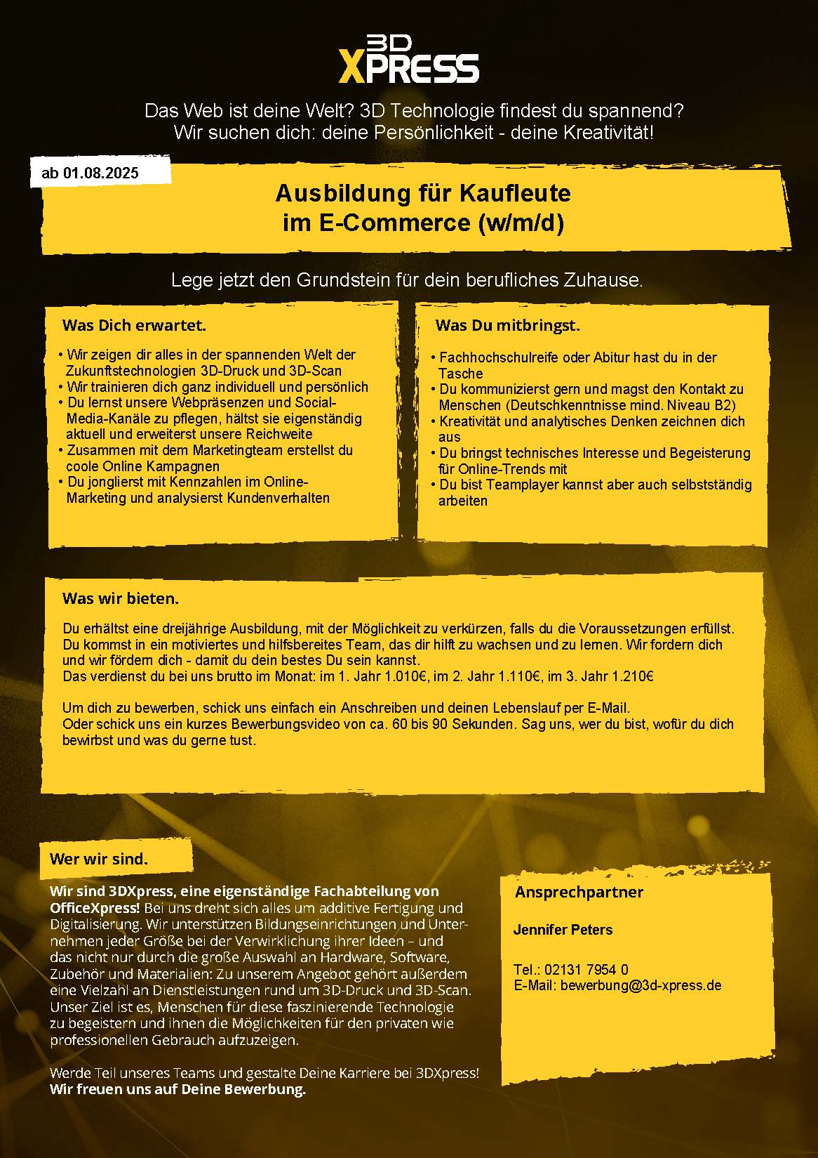 Machen Sie Karriere bei OfficeXpress vom Auszubildenden zum Account Manager, Consultant, Berater, Vertriebsmitarbeiter oder Teamleiter rund um die Branchen Druck, Drucklösungen, 3D-Druck, 3D-Scan und zugehörige Dienstleistungen!